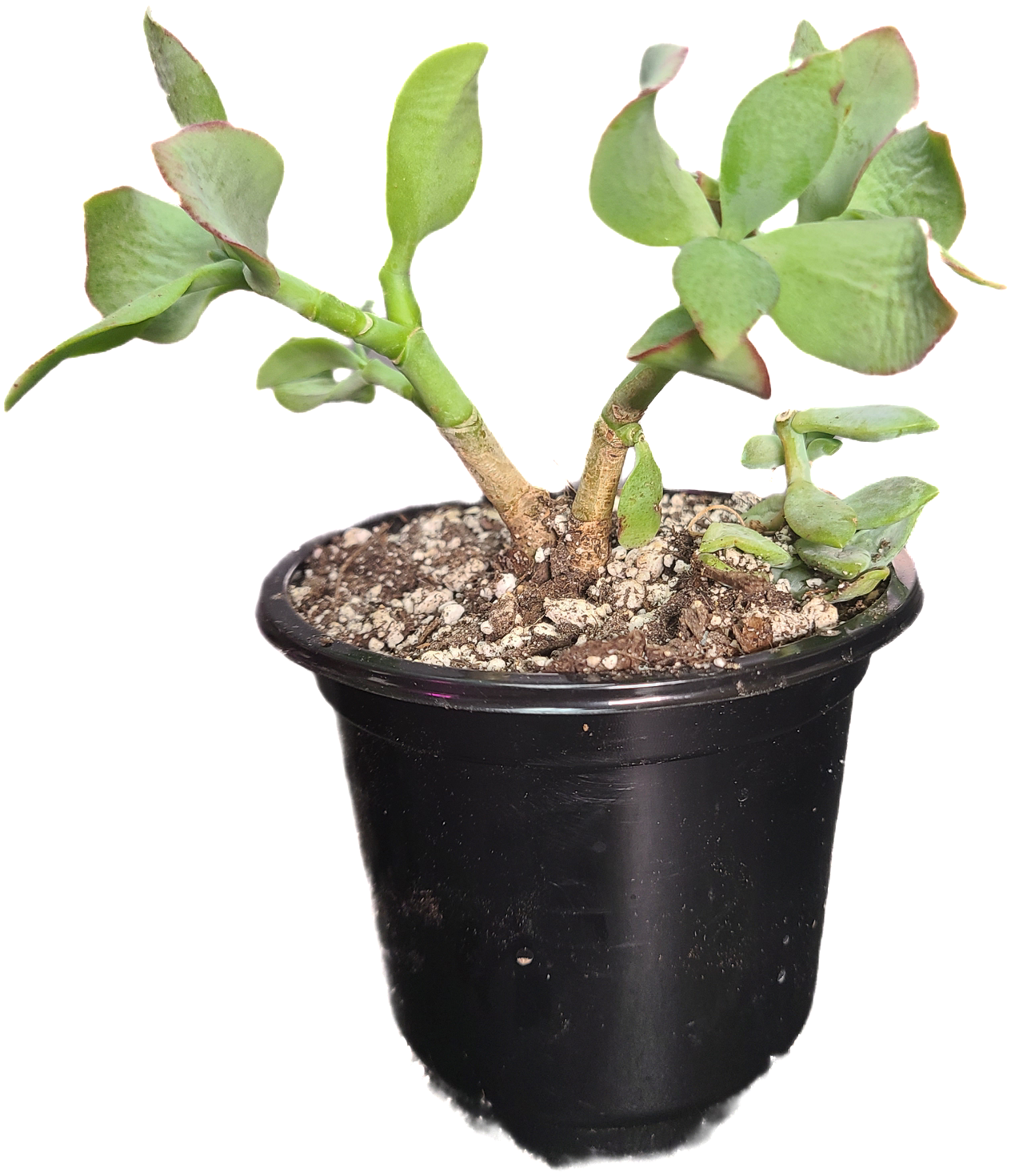 The image shows a succulent plant, likely a 'Ripple Jade' or 'Crassula arborescens ssp. undulatifolia'. This plant is a variety of the Silver Dollar Plant, known for its unique, wavy, blue-gray leaves.The leaves can develop maroon-red edges when exposed to sufficient sunlight. It is a slow-growing succulent shrub that is drought-tolerant once established and can be grown as a houseplant or in a garden setting in appropriate climates.. Like other jade plants, it prefers well-drained soil and requires deep watering only after the soil has dried out to prevent root rot.